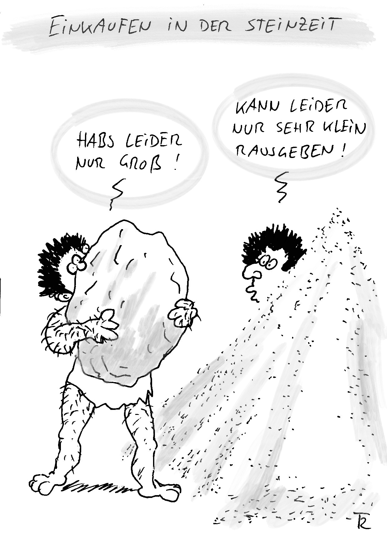Ancient joke – Shopping in the Stone Age. „I only have it in large size, unfortunately.“ „I can only give you very small change, unfortunately.“